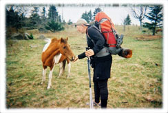 When I woke this morning and climbed out of my tent, there to my amazement was a herd of wild ponies. They were all around my camp site. I grabbed my camera and took lots of pictures. They were not bothered by me being there; so I walked a little closer and petted some of them. What a wonderful experience. I climbed Mt Rogers today and camped past the Thomas Knob Shelter. I had a good hike of 16 miles.